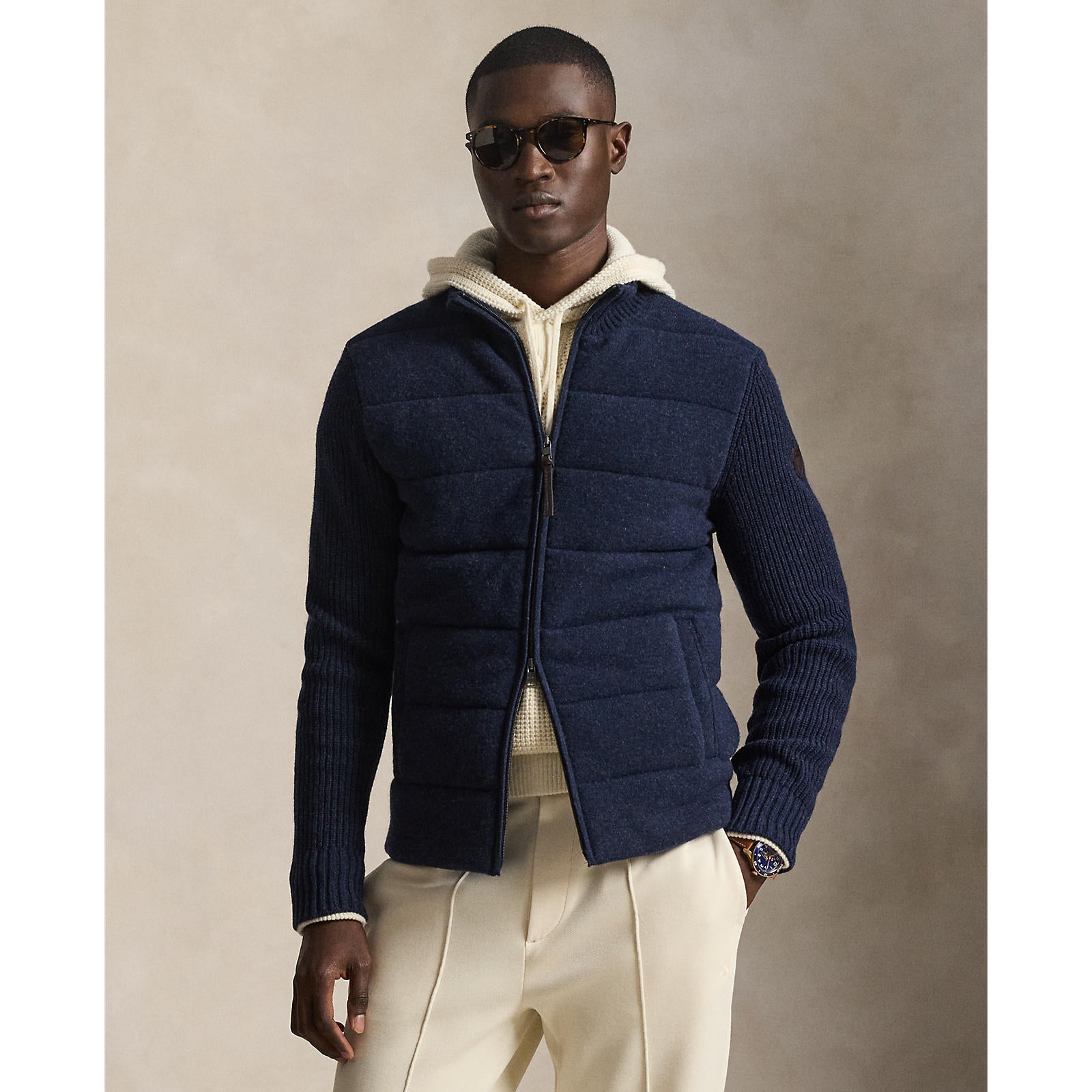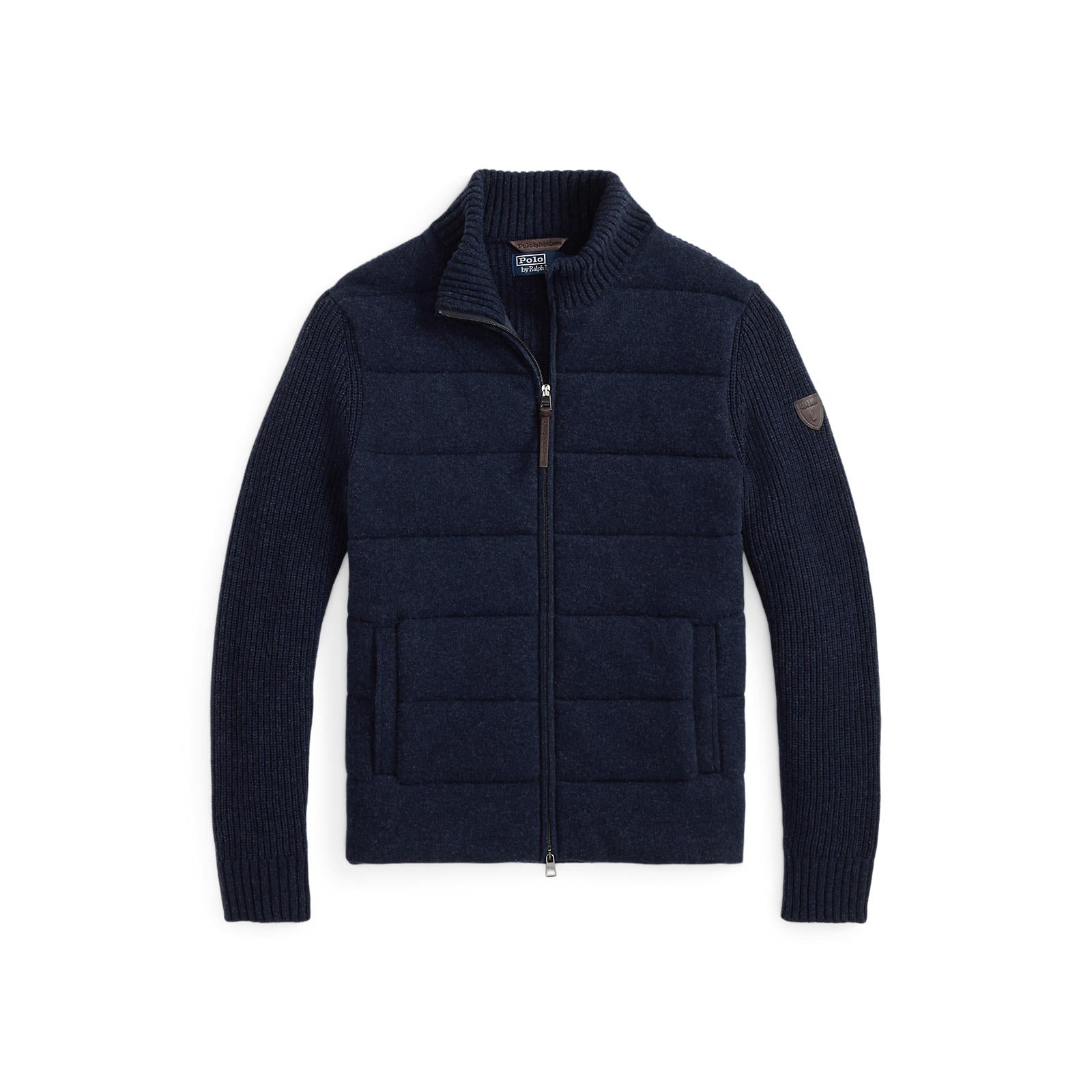 Refined layering meets modern performance in this Polo Ralph Lauren hybrid jacket. Designed with a quilted woven front panel and premium knit sleeves and back, it blends tailored structure with soft, insulating comfort. The contrast textures create depth while maintaining a streamlined silhouette, making it ideal for transitional weather and smart-casual styling. Finished with a stand collar and full zip fastening, this versatile piece moves effortlessly from weekday commutes to weekend city wear.