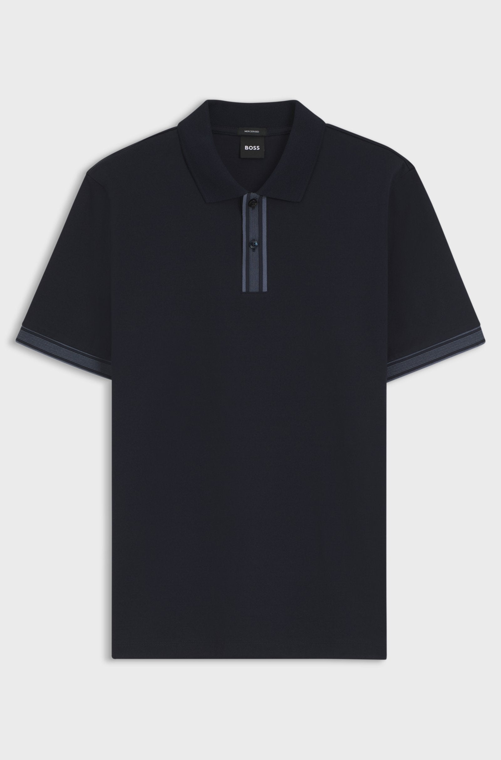 Refresh smart-casual wardrobes with this BOSS Menswear polo shirt, designed with subtle sporty detailing and a clean, modern silhouette. Crafted from mercerised cotton for exceptional softness and a refined finish, the fabric offers enhanced durability and a smooth feel against the skin. Striped accents on the placket and sleeves add a contemporary touch, while the structured trims and classic polo collar maintain a polished appearance suited to both casual and smart occasions.
